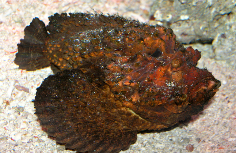 All’Acquario di Alghero, tra le altre creature marine in esposizione, c’è anche il pesce più velenoso del mondo. Si tratta del Pesce Pietra, nome scientifico Synanceia verrucosa, comunemente chiamato così per via del corpo tozzo, con testa e bocca molto grandi, e pure le pinne sono grosse, tozze e arrotondate. Il corpo è completamente ricoperto di escrescenze carnose e callose e altre simili a piccole alghe, dando a questa specie l'aspetto di una roccia incrostata di alghe e coralli. Confermato come il più velenoso esistente in natura, il pesce pietra ha un veleno lattiginoso che viene a scopo difensivo. Gli aculei che reggono la pinna dorsale, da 12 a 14, sono collegati a ghiandole velenifere che secernono per pressione diretta un potente veleno, nel caso un predatore decida di cibarsi o tocchi direttamente il pesce. Il veleno produce un forte dolore e gonfiore alla zona d'iniezione, che si estende in tutto il corpo e provoca in seguito tachicardia. Se non curata, la puntura è letale. Il veleno è termolabile, quindi in caso di puntura la prima cosa da fare è immergere la parte colpita in acqua molto calda, in attesa che un medico somministri l'antidoto. Il pesce pietra sfrutta il suo perfetto mimetismo per predare ogni pesce e crostaceo che capiti a portata della sua grande bocca. Può raggiungere una lunghezza di 40 centimetri.