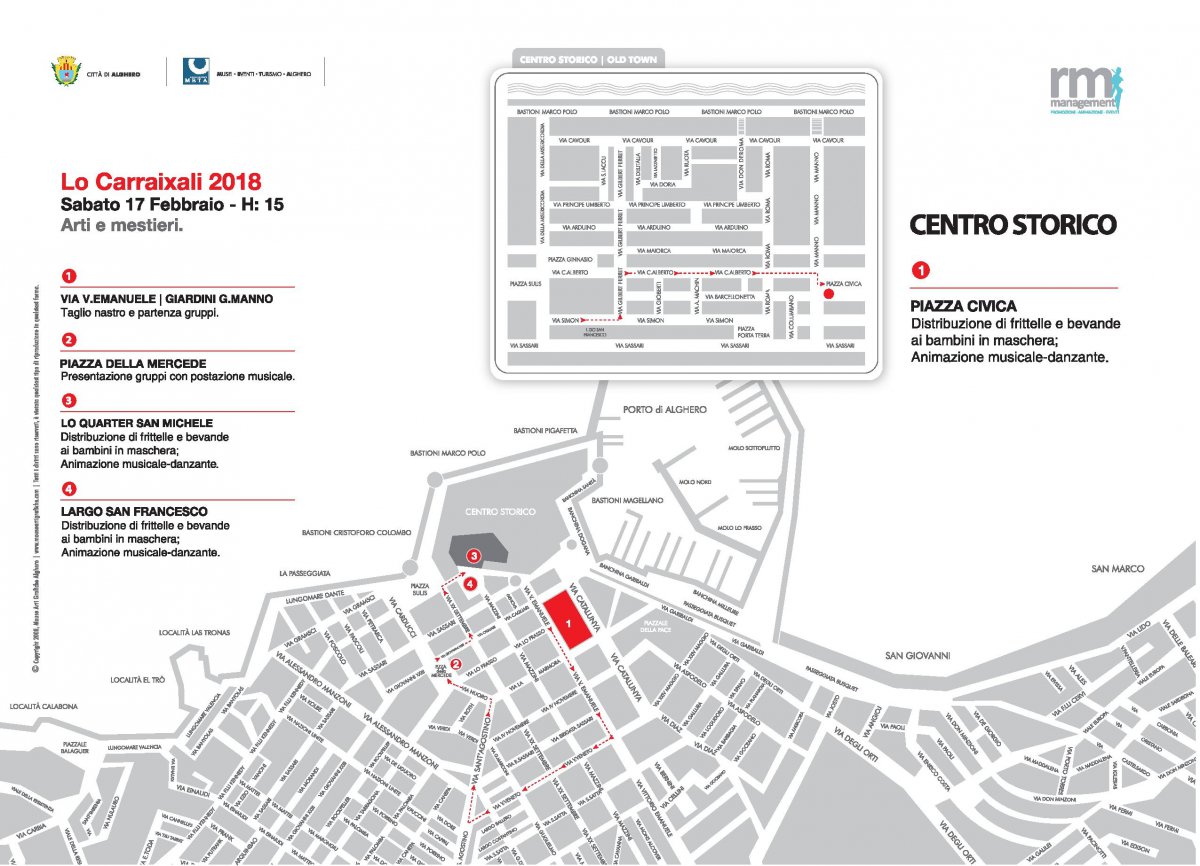 Per conoscere il percorso completo della sfilata di Sabato 17 febbraio 2018 è possibile consultare la mappa qui sotto in allegato (tratta dal sito ufficiale di Alghero Turismo).